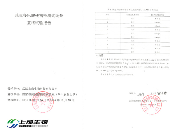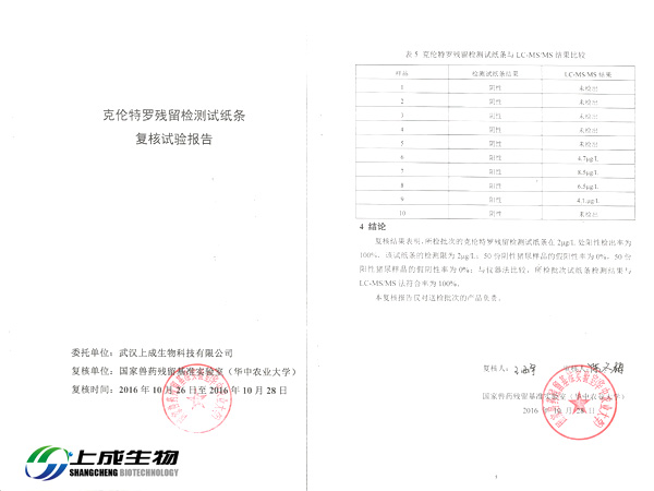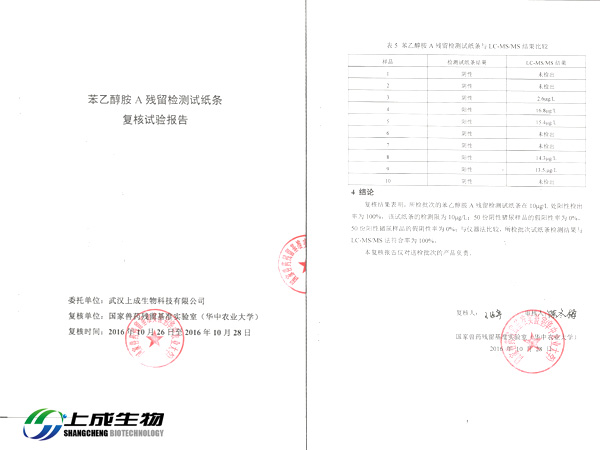 2016年10月26日,上成生物將苯乙醇胺A殘留檢測試紙條、克倫特羅殘留檢測試紙條、萊克多巴胺殘留檢測試紙條和沙丁胺醇?xì)埩魴z測試紙條四款膠體金檢測試紙條送到國家獸藥殘留基準(zhǔn)實(shí)驗(yàn)室(華中農(nóng)業(yè)大學(xué))做復(fù)核實(shí)驗(yàn)。實(shí)驗(yàn)內(nèi)容包括:檢測限、假陽性率、假陰性率和儀器對比。經(jīng)過實(shí)驗(yàn)檢測產(chǎn)品全部達(dá)到國家標(biāo)準(zhǔn)。