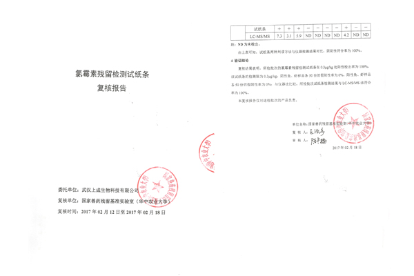 2017年2月12日,上成生物將硝基呋喃代謝物殘留檢測(cè)試紙條、氯霉素殘留檢測(cè)試紙條兩種檢測(cè)產(chǎn)品送到國家獸藥殘留基準(zhǔn)實(shí)驗(yàn)室(華中農(nóng)業(yè)大學(xué))做復(fù)核試驗(yàn)。實(shí)驗(yàn)內(nèi)容包括:檢測(cè)限、假陽性率、假陰性率和儀器對(duì)比。經(jīng)過檢測(cè)產(chǎn)品全部達(dá)到國家標(biāo)準(zhǔn)。