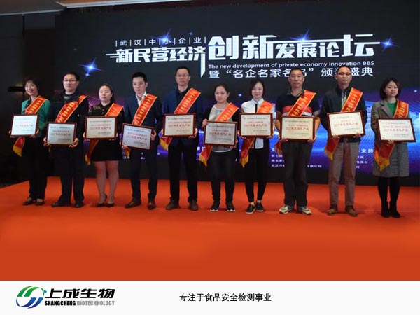 上成生物受邀參加武漢中小企業(yè)新民營經(jīng)濟(jì)創(chuàng)新發(fā)展論壇暨“名企名家名品”頒獎盛典,其“硝基呋喃類快速檢測試劑”榮獲2017年度名優(yōu)產(chǎn)品。產(chǎn)品原理是樣品中硝基呋喃類代謝物經(jīng)衍生處理后,其衍生物與膠體金標(biāo)記的特異性抗體結(jié)合,抑制抗體和檢測卡/試紙條中檢測線(T線)上硝基呋喃類代謝物-BSA偶聯(lián)物的免疫反應(yīng),從而導(dǎo)致檢測線顏色深淺的變化。通過檢測線與控制線(C線)顏色深淺比較,對樣品中硝基呋喃類代謝物進(jìn)行定性判定。