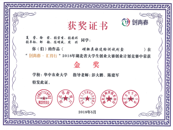 上成生物陳建軍總經(jīng)理作為項目的創(chuàng)業(yè)導(dǎo)師,聯(lián)合華中農(nóng)業(yè)大學(xué)彭大鵬教授等科研團(tuán)隊參加“創(chuàng)青春?匯得行”2018年湖北省大學(xué)生創(chuàng)業(yè)大賽計劃競賽,其磺胺類快速檢測試劑盒榮獲金獎。