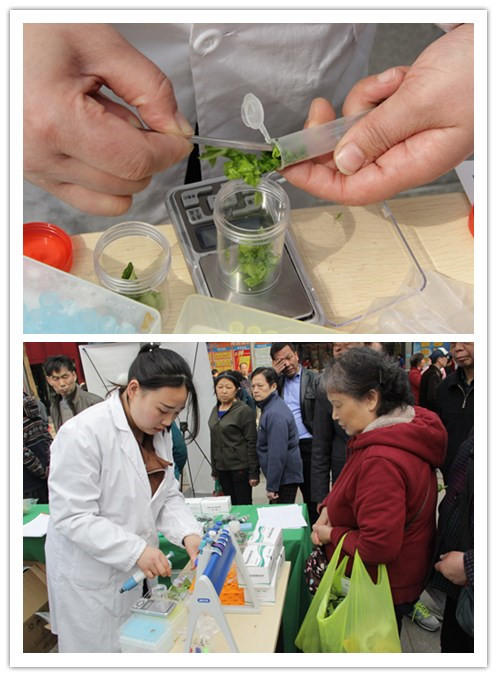 上成生物檢測員利用快檢產品,為社區(qū)群眾檢測日常食用蔬菜的農藥殘留,檢測結果全部合格,眾人紛紛表示可以放心食用。